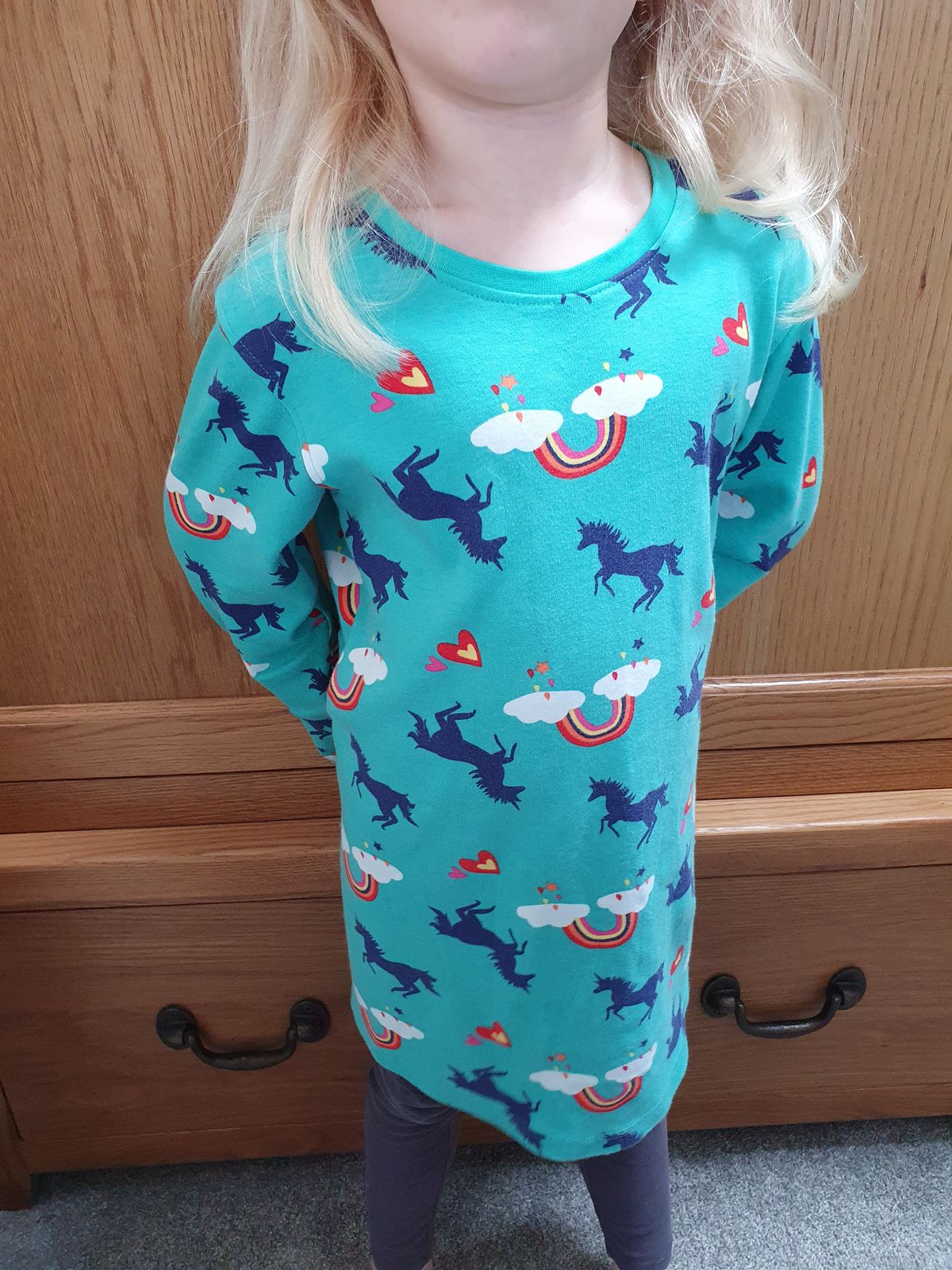 我们可爱的蓝绿色长袖连衣裙与我们的 Rainbow 青少年紧身裤相得益彰。这件连衣裙全身印有海军蓝独角兽、彩虹、蓬松的云朵和五颜六色的心形。