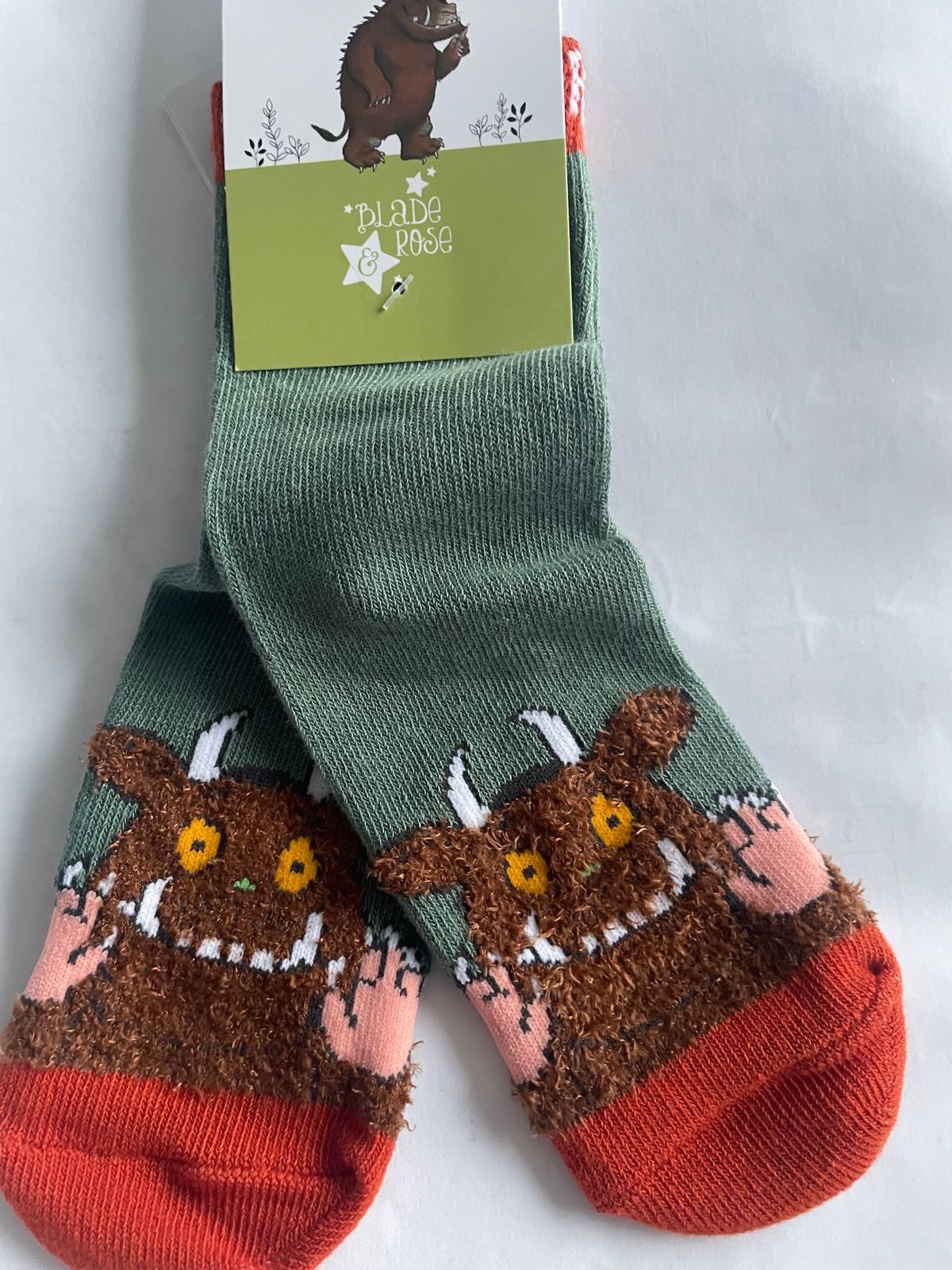 Introducing the delightful Gruffalo children's socks - the perfect addition to any wardrobe! These socks come in a lovely Khaki and brown colourway, with a playful Gruffalo print on the front, in a contrasting fluffy yarn material.