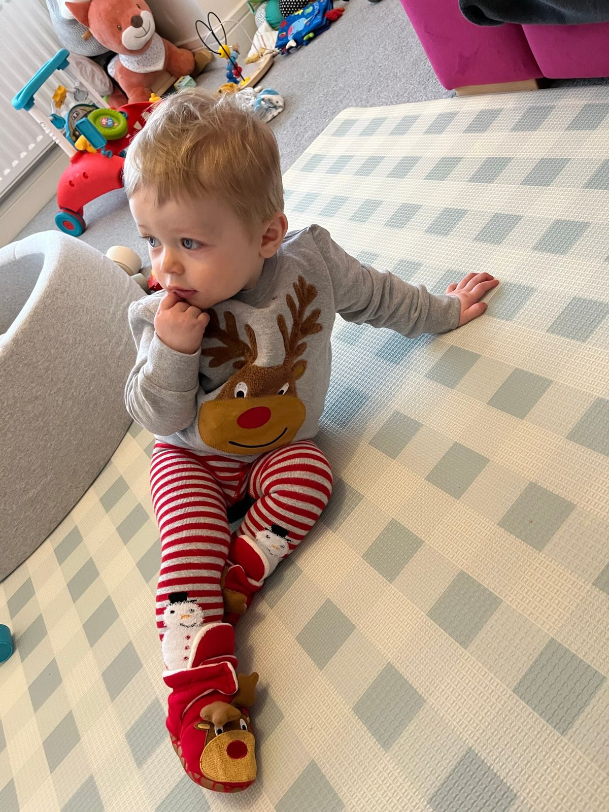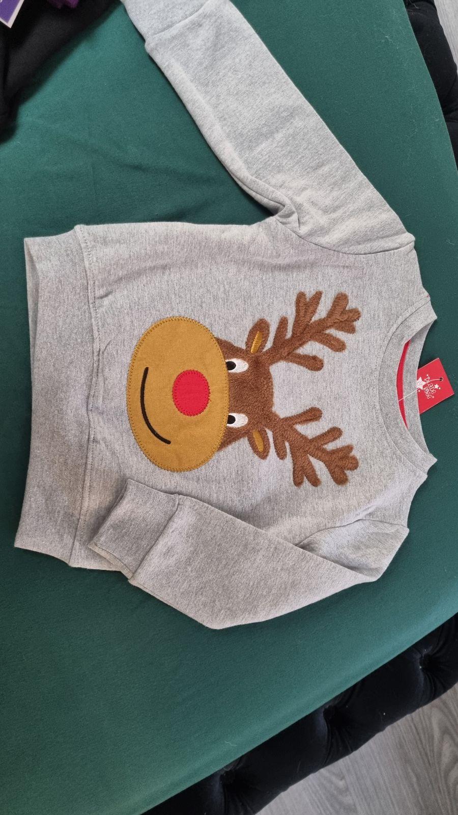 灰色泥灰套头衫,饰有贴花和刺绣的柔软羊毛驯鹿图案。这是为您的小精灵批准的圣诞老人。