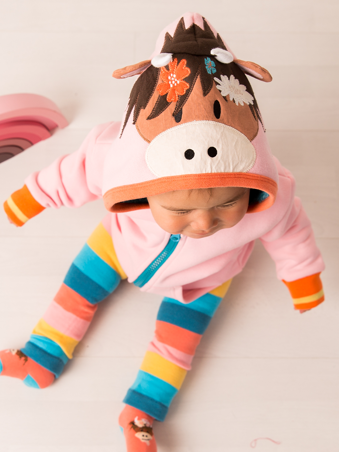 Our new pink hoodie features a hood with our new Bonnie Highland Cow face with perky ears and horns. Ideal if your little one likes standing out from the crowd or if they love anything nature related!